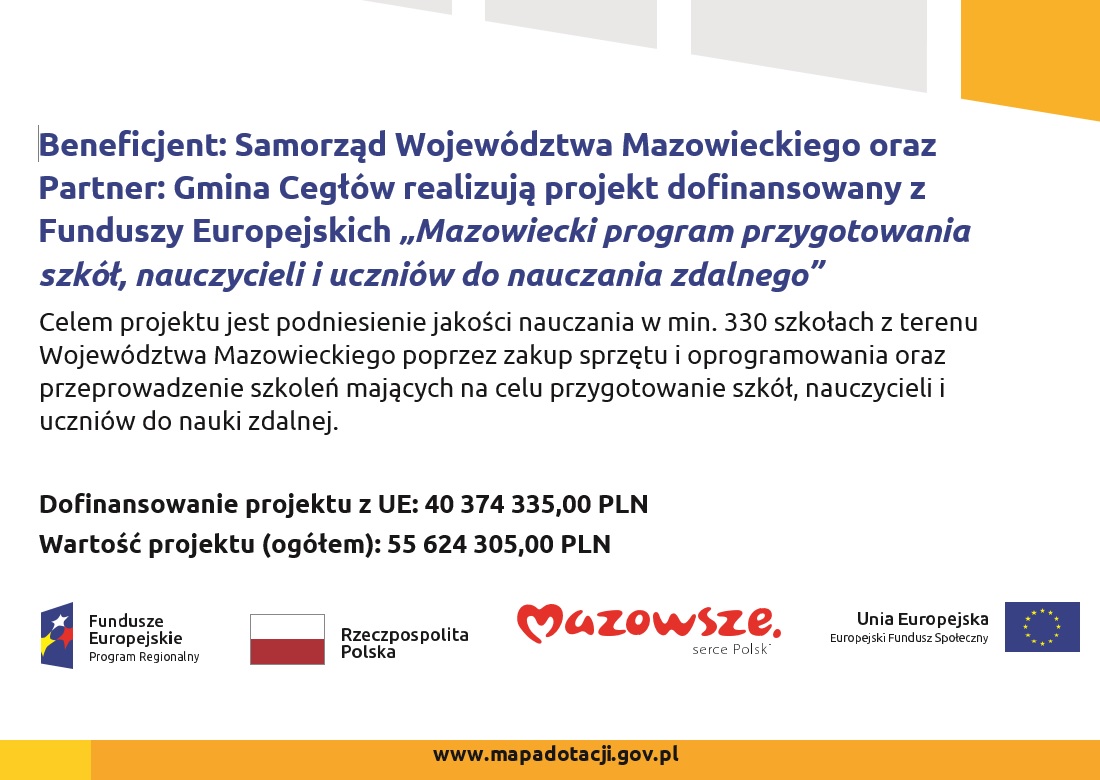 Gmina Cegłów w partnerstwie z Samorządem Województwa Mazowieckiego realizuje projekt pn. „Mazowiecki program przygotowania szkół, nauczycieli i uczniów do nauczania zdalnego” w ramach X Osi priorytetowej „Edukacja dla rozwoju regionu”, Działania 10.1 „Kształcenie i rozwój dzieci i młodzieży”,Poddziałania 10.1.1 „Edukacja ogólna”, którego celem jest podniesienie jakości nauczania w min. 330 szkołach z terenu Województwa Mazowieckiego poprzez zakup sprzętu i oprogramowania oraz przeprowadzenie szkoleń mających na celu przygotowanie szkół, nauczycieli i uczniów do nauki zdalnej. W ramach projektu Zespół Szkolny w Cegłowie otrzyma pakiet sprzętu w postaci: zestawów komputerowych, laptopów, drukarek, urządzenia wielofunkcyjnego, projektora multimedialnego, monitora interaktywnego oraz pakiet oprogramowań wspierających naukę zdalną. Ponadto wsparciem szkoleniowym w zakresie nauczania zdalnego objęci zostaną nauczyciele i uczniowie. Wartość projektu wynosi 55 624 305, 00 zł, natomiast dofinansowanie ze środków Unii Europejskiej wynosi: 40 374 335, 00 zł.