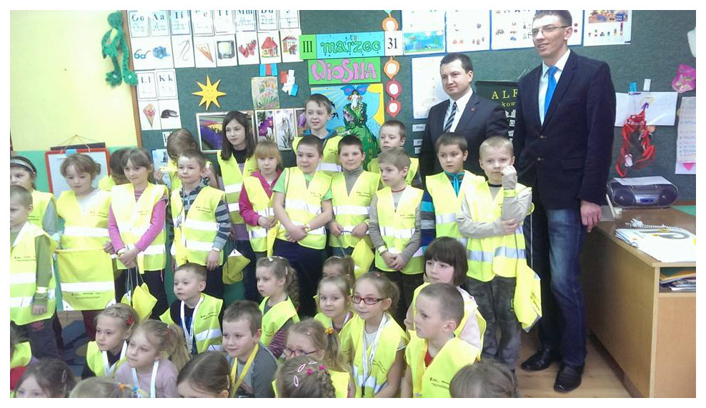Pan Mariusz Kozera przeprowadził pogadankę z wychowankami przedszkola i uczniami szkoły, na temat bezpiecznego poruszania się po drogach. Aby poprawić widoczność dzieci na drogach otrzymały one od gościa upominki w postaci odblaskowych opasek, worków, kamizelek. Na koniec spotkania zrobiono pamiątkowe zdjęcie.