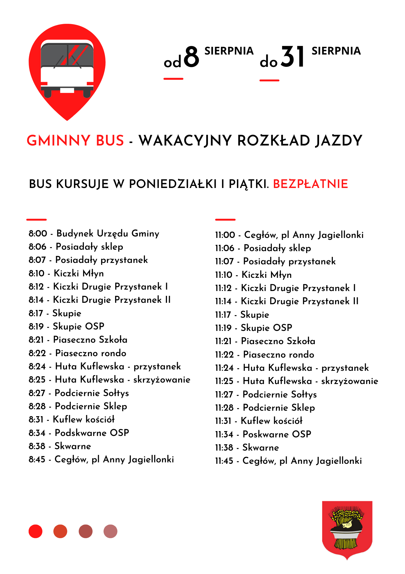 Informujemy o uruchomieniu gminnego busa, który będzie kursował w poniedziałki i piątki po terenie gminy Cegłów