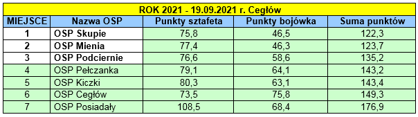 W dniu 19.09.2021 r. w Cegłowie, odbyły się gminne zawody sportowo-pożarnicze Ochotniczych Straży Pożarnych z terenu gminy Cegłów. Zawody przeprowadzono w trzech konkurencjach – sztafeta pożarnicza 7 x 50 m z przeszkodami, ćwiczenie bojowe i musztra. W zawodach wzięło udział 7 drużyn (OSP Pełczanka, OSP Kiczki, OSP Skupie, OSP Podciernie, OSP Cegłów, OSP Mienia i OSP Posiadały).