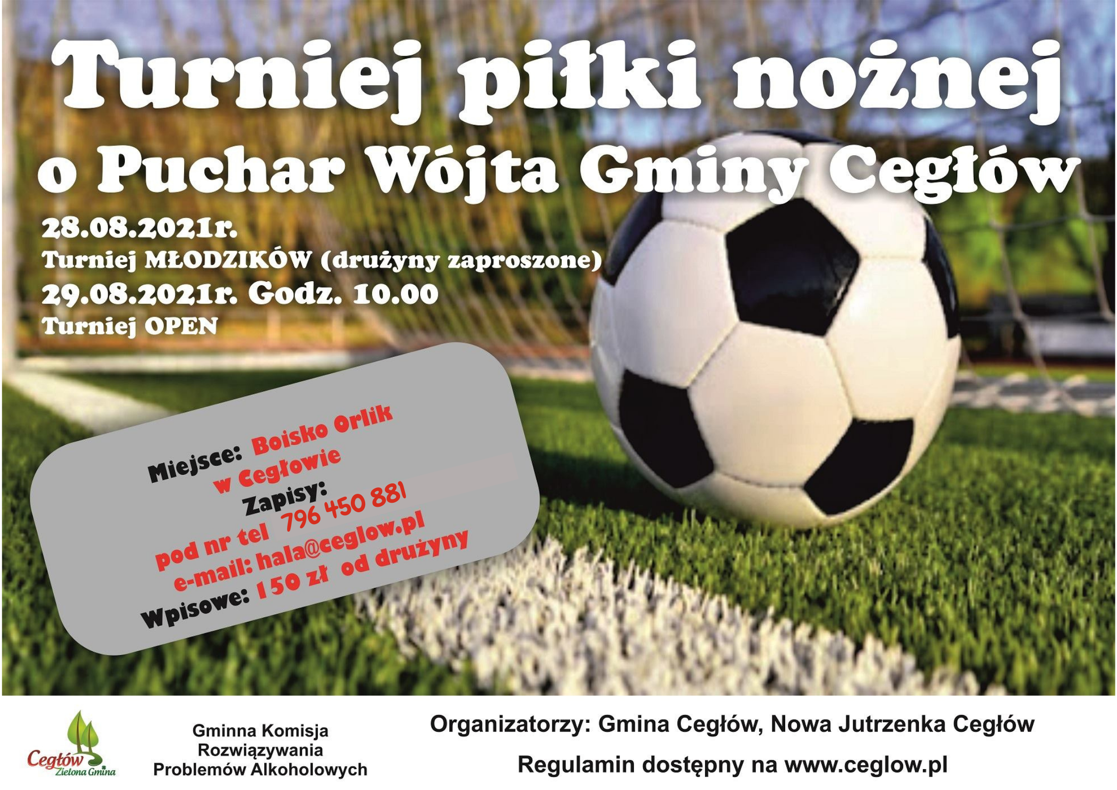 Wójt Gminy Cegłów, zaprasza do wzięcia udziału w turnieju piłkarskim, który odbędzie się dnia 29 sierpnia br. na boiskach przy Zespole Szkolnym w Cegłowie. Start godz. 10:00. Więcej informacji na plakacie i w regulaminie turnieju.