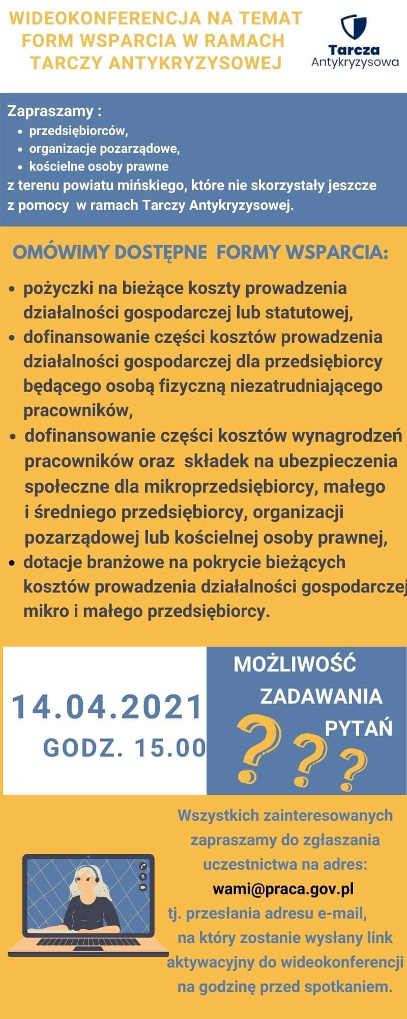 Do udziału w spotkaniu zapraszamy przedsiębiorców, organizacje pozarządowe, kościelne osoby prawne z terenu powiatu mińskiego, które zostały dotknięte negatywnymi skutkami pandemii koronawirusa, a nie skorzystały jeszcze z pomocy oferowanej w ramach Tarczy Antykryzysowej.
